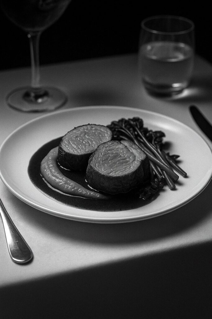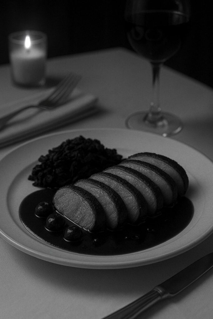Lightly smoked duck paired with turtle beans and a black cherry gastrique.