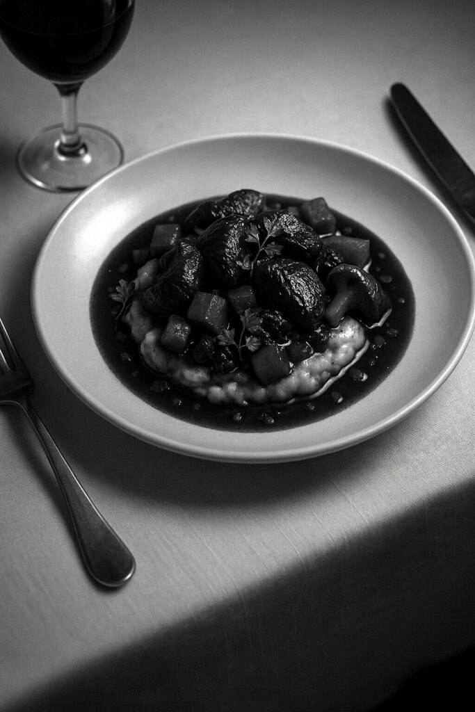 Braised wild mushrooms with roasted chestnuts and root vegetables in a red wine reduction, served over creamy polenta.